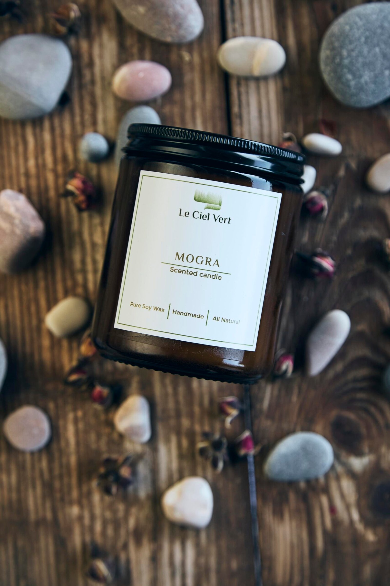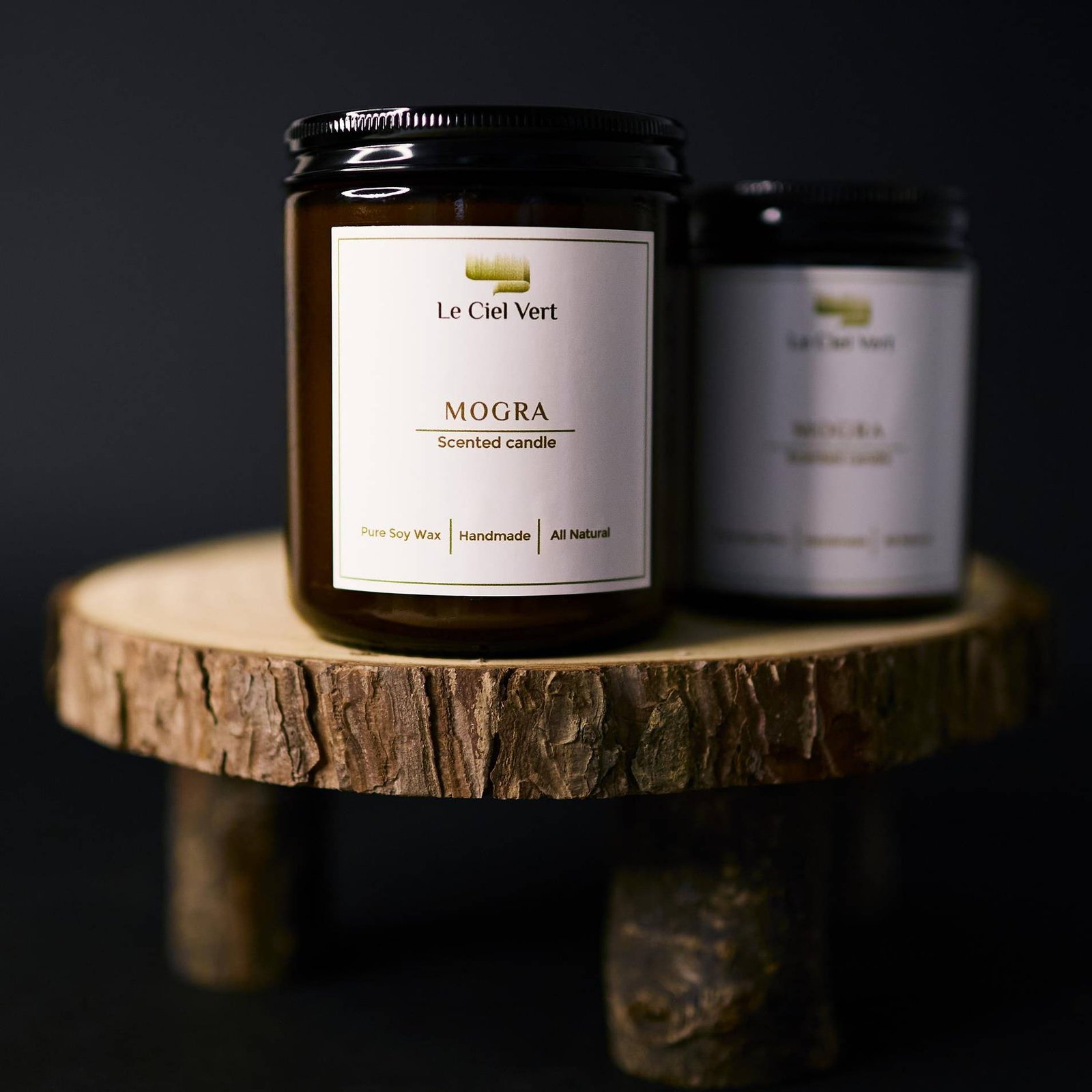 Known for its calming and mood-lifting aura, mogra releases a creamy, velvety sweetness that feels both delicate and deeply sensual. As the candle burns, layers of dewy petals, gentle green undertones, and a whisper of soft musk unfold slowly — like stepping into a tranquil garden at dusk, where blossoms glow under the moonlight.
